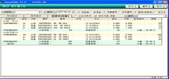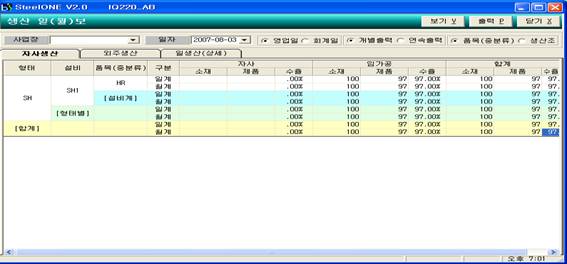 - 일자: 영업일 또는 회계일을 기준으로 하여 생산내역을 조회한다.