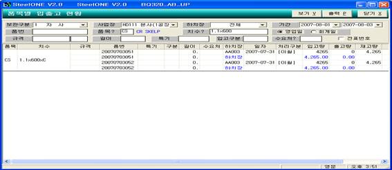 1) 조회조건 : 보관구분, 사업장, 하치장, 품번, 품목, 치수, 규격, 길이, 특기, 입고구분, 수요처