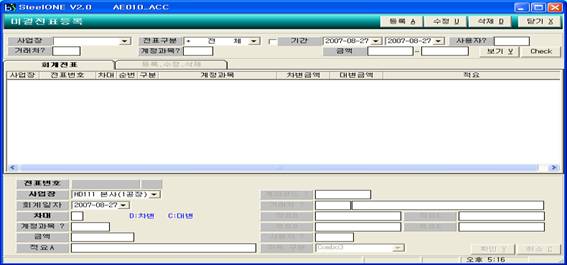 - Check 버튼 : 기간 중 처리한 자료 중에서 차변과 대변이 틀린 자료만 조회 하는 기능이다. 차변, 대변이 틀린 전표는 반드시 수정 해야 한다.